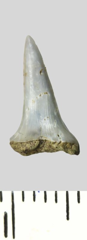 Зуб (фрагмент). Акула. Odontaspis whitei Arambourg, 1952. Классификация: Хордовые Chordata, Позвоночные Vertebrata, Хрящевые рыбы Chondrichthyes, Пластиножаберные Elasmobranchii