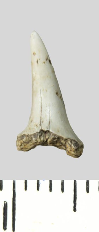 Зуб (фрагмент). Акула. Odontaspis whitei Arambourg, 1952. Классификация: Хордовые Chordata, Позвоночные Vertebrata, Хрящевые рыбы Chondrichthyes, Пластиножаберные Elasmobranchii
