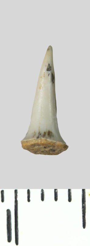 Зуб (фрагмент). Акула. Odontaspis whitei Arambourg, 1952. Классификация: Хордовые Chordata, Позвоночные Vertebrata, Хрящевые рыбы Chondrichthyes, Пластиножаберные Elasmobranchii