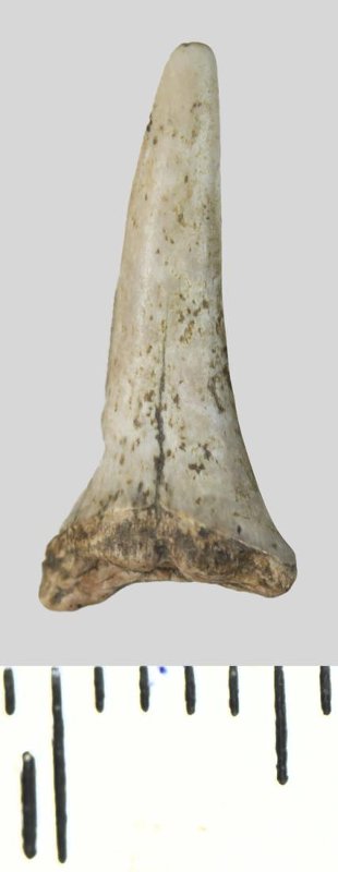 Зуб (фрагмент). Акула. Odontaspis whitei Arambourg, 1952. Классификация: Хордовые Chordata, Позвоночные Vertebrata, Хрящевые рыбы Chondrichthyes, Пластиножаберные Elasmobranchii