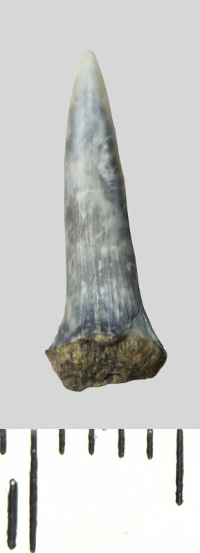 Зуб (фрагмент). Акула. Odontaspis whitei Arambourg, 1952. Классификация: Хордовые Chordata, Позвоночные Vertebrata, Хрящевые рыбы Chondrichthyes, Пластиножаберные Elasmobranchii