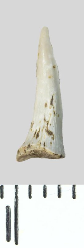Зуб (фрагмент). Акула. Odontaspis whitei Arambourg, 1952. Классификация: Хордовые Chordata, Позвоночные Vertebrata, Хрящевые рыбы Chondrichthyes, Пластиножаберные Elasmobranchii
