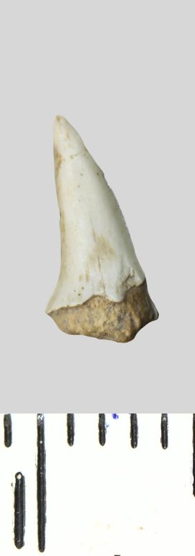 Зуб (фрагмент). Акула. Odontaspis whitei Arambourg, 1952. Классификация: Хордовые Chordata, Позвоночные Vertebrata, Хрящевые рыбы Chondrichthyes, Пластиножаберные Elasmobranchii