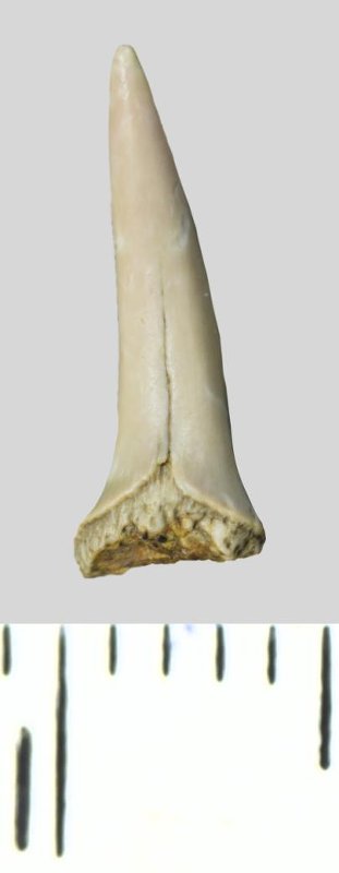 Зуб (фрагмент). Акула. Odontaspis whitei Arambourg, 1952. Классификация: Хордовые Chordata, Позвоночные Vertebrata, Хрящевые рыбы Chondrichthyes, Пластиножаберные Elasmobranchii