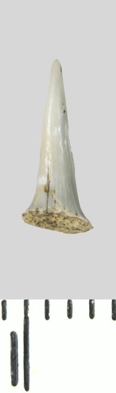 Зуб (фрагмент). Акула. Odontaspis whitei Arambourg, 1952. Классификация: Хордовые Chordata, Позвоночные Vertebrata, Хрящевые рыбы Chondrichthyes, Пластиножаберные Elasmobranchii