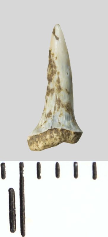 Зуб (фрагмент). Акула. Odontaspis whitei Arambourg, 1952. Классификация: Хордовые Chordata, Позвоночные Vertebrata, Хрящевые рыбы Chondrichthyes, Пластиножаберные Elasmobranchii