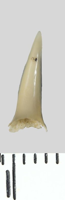 Зуб (фрагмент). Акула. Palaeohypotodus speyeri (Darteville & Casier, 1943). Классификация: Хордовые Chordata, Позвоночные Vertebrata, Хрящевые рыбы Chondrichthyes, Пластиножаберные Elasmobranchii