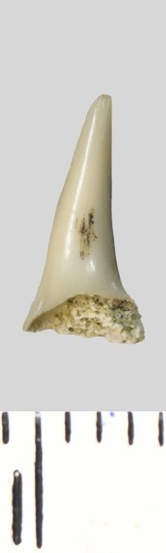 Зуб (фрагмент). Акула. Palaeohypotodus speyeri (Darteville & Casier, 1943). Классификация: Хордовые Chordata, Позвоночные Vertebrata, Хрящевые рыбы Chondrichthyes, Пластиножаберные Elasmobranchii