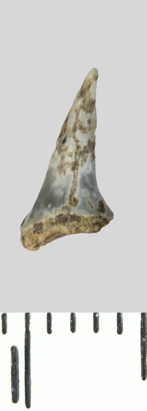 Зуб (фрагмент). Акула. Odontaspis whitei Arambourg, 1952. Классификация: Хордовые Chordata, Позвоночные Vertebrata, Хрящевые рыбы Chondrichthyes, Пластиножаберные Elasmobranchii