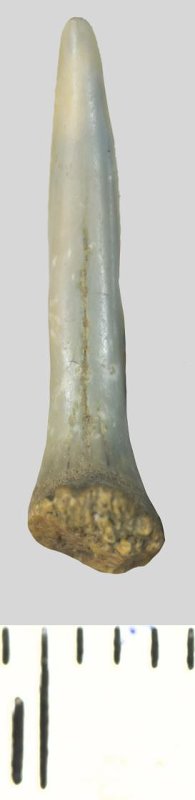 Зуб (фрагмент). Акула. Odontaspis whitei Arambourg, 1952. Классификация: Хордовые Chordata, Позвоночные Vertebrata, Хрящевые рыбы Chondrichthyes, Пластиножаберные Elasmobranchii