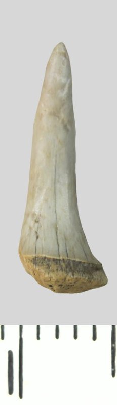 Зуб (фрагмент). Акула. Odontaspis whitei Arambourg, 1952. Классификация: Хордовые Chordata, Позвоночные Vertebrata, Хрящевые рыбы Chondrichthyes, Пластиножаберные Elasmobranchii