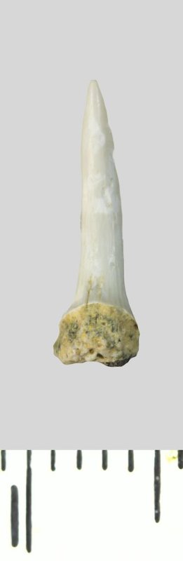 Зуб (фрагмент). Акула. Odontaspis whitei Arambourg, 1952. Классификация: Хордовые Chordata, Позвоночные Vertebrata, Хрящевые рыбы Chondrichthyes, Пластиножаберные Elasmobranchii