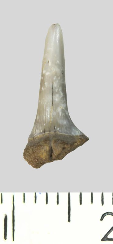 Зуб (фрагмент). Акула. Odontaspis whitei Arambourg, 1952. Классификация: Хордовые Chordata, Позвоночные Vertebrata, Хрящевые рыбы Chondrichthyes, Пластиножаберные Elasmobranchii