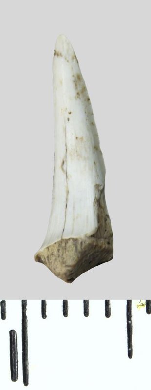 Зуб (фрагмент). Акула. Odontaspis whitei Arambourg, 1952. Классификация: Хордовые Chordata, Позвоночные Vertebrata, Хрящевые рыбы Chondrichthyes, Пластиножаберные Elasmobranchii