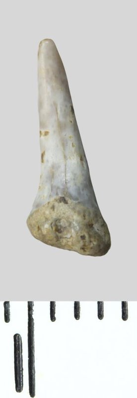 Зуб (фрагмент). Акула. Odontaspis whitei Arambourg, 1952. Классификация: Хордовые Chordata, Позвоночные Vertebrata, Хрящевые рыбы Chondrichthyes, Пластиножаберные Elasmobranchii