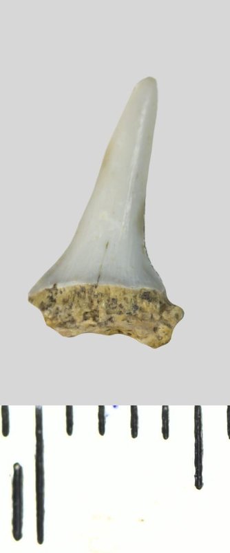 Зуб (фрагмент). Акула. Odontaspis whitei Arambourg, 1952. Классификация: Хордовые Chordata, Позвоночные Vertebrata, Хрящевые рыбы Chondrichthyes, Пластиножаберные Elasmobranchii