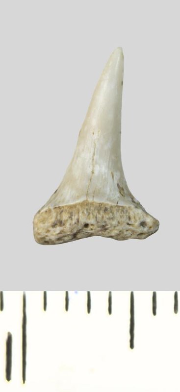 Зуб. Акула. Odontaspis whitei Arambourg, 1952. Классификация: Хордовые Chordata, Позвоночные Vertebrata, Хрящевые рыбы Chondrichthyes, Пластиножаберные Elasmobranchii