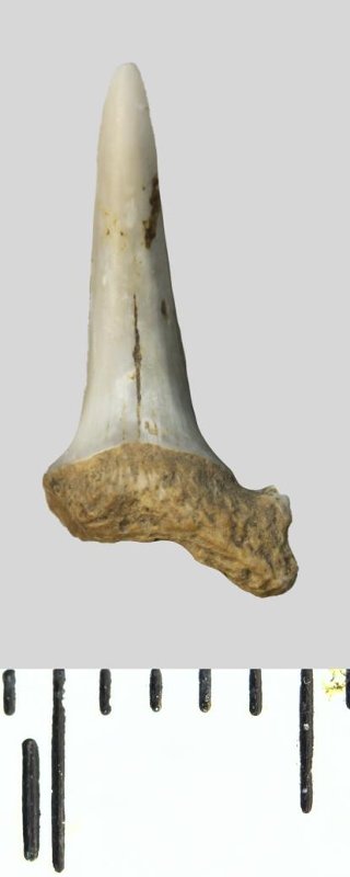 Зуб. Акула. Odontaspis whitei Arambourg, 1952. Классификация: Хордовые Chordata, Позвоночные Vertebrata, Хрящевые рыбы Chondrichthyes, Пластиножаберные Elasmobranchii