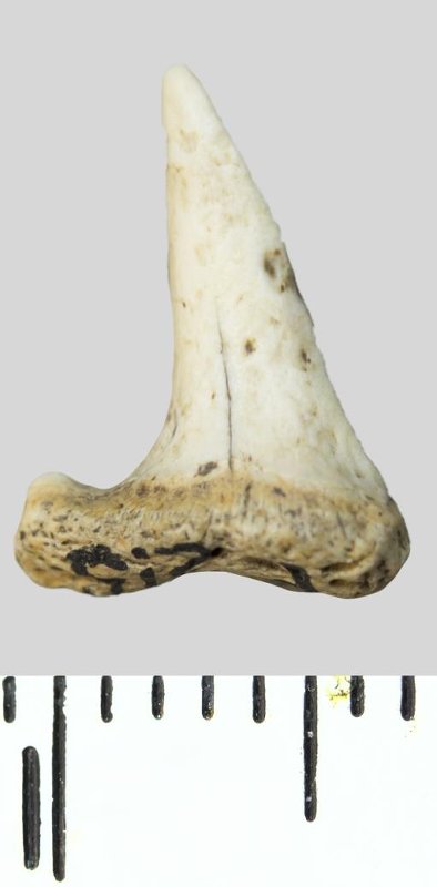 Зуб. Акула. Odontaspis whitei Arambourg, 1952. Классификация: Хордовые Chordata, Позвоночные Vertebrata, Хрящевые рыбы Chondrichthyes, Пластиножаберные Elasmobranchii