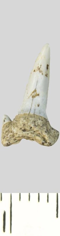 Зуб. Акула. Striatolamia striata (Winkler, 1874). Классификация: Хордовые Chordata, Позвоночные Vertebrata, Хрящевые рыбы Chondrichthyes, Пластиножаберные Elasmobranchii