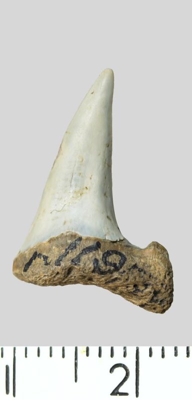 Зуб. Акула. Otodus minor mediavus (Leriche, 1942). Классификация: Хордовые Chordata, Позвоночные Vertebrata, Хрящевые рыбы Chondrichthyes, Пластиножаберные Elasmobranchii