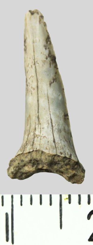 Зуб (фрагмент). Акула. Striatolamia striata (Winkler, 1874). Классификация: Хордовые Chordata, Позвоночные Vertebrata, Хрящевые рыбы Chondrichthyes, Пластиножаберные Elasmobranchii