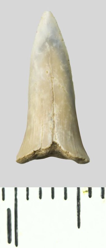 Зуб (фрагмент). Акула. Striatolamia striata (Winkler, 1874). Классификация: Хордовые Chordata, Позвоночные Vertebrata, Хрящевые рыбы Chondrichthyes, Пластиножаберные Elasmobranchii
