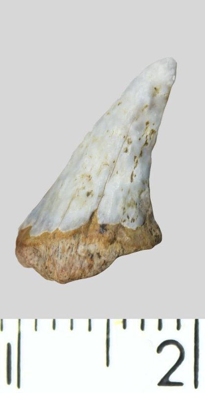 Зуб (фрагмент). Акула. Palaeohypotodus rutoti (Winkler, 1874). Классификация: Хордовые Chordata, Позвоночные Vertebrata, Хрящевые рыбы Chondrichthyes, Пластиножаберные Elasmobranchii