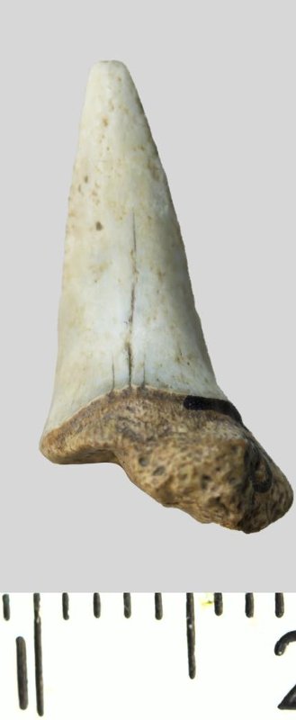 Зуб (фрагмент). Акула. Palaeohypotodus rutoti (Winkler, 1874). Классификация: Хордовые Chordata, Позвоночные Vertebrata, Хрящевые рыбы Chondrichthyes, Пластиножаберные Elasmobranchii