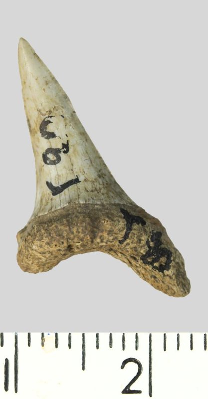 Зуб. Акула. Palaeohypotodus rutoti (Winkler, 1874). Классификация: Хордовые Chordata, Позвоночные Vertebrata, Хрящевые рыбы Chondrichthyes, Пластиножаберные Elasmobranchii