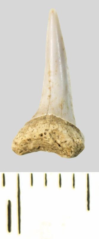 Зуб (фрагмент). Акула. Eostriatolamia subulata (Agassiz, 1843). Классификация: Хордовые Chordata, Позвоночные Vertebrata, Хрящевые рыбы Chondrichthyes, Пластиножаберные Elasmobranchii, Акулы Selachii, Ламнообразные Lamniformes, Песчаные акулы Odontaspididae