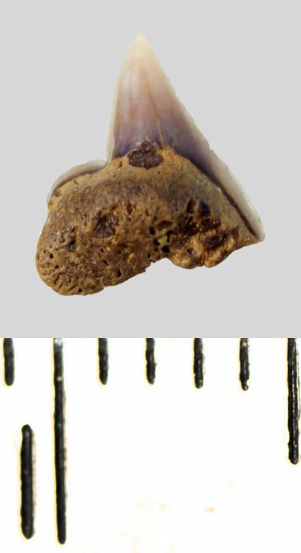 Зуб. Акула. Palaeoanacorax volgensis Glueckman, 1971. Классификация: Хордовые Chordata, Позвоночные Vertebrata, Хрящевые рыбы Chondrichthyes, Пластиножаберные Elasmobranchii, Акулы Selachii, Ламнообразные Lamniformes, Anacoracidae
