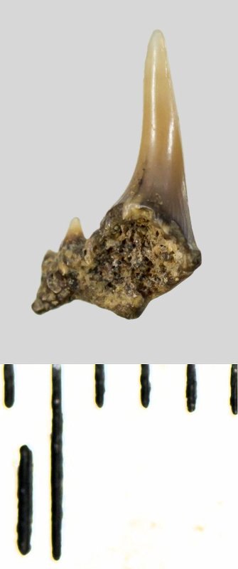 Зуб (фрагмент). Акула. Synechodus dubrisiensis (Mackie, 1863). Классификация: Хордовые Chordata, Позвоночные Vertebrata, Хрящевые рыбы Chondrichthyes, Пластиножаберные Elasmobranchii, Акулы Selachii, Синеходонтообразные Synechodontiformes
