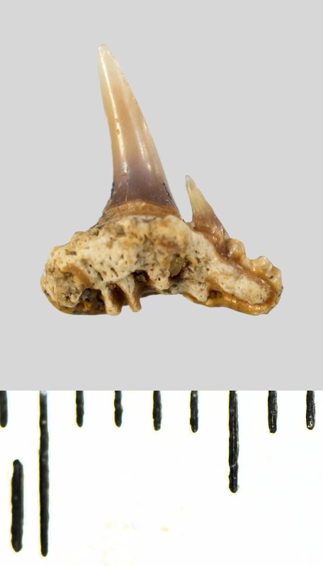 Зуб. Акула. Synechodus dubrisiensis (Mackie, 1863). Классификация: Хордовые Chordata, Позвоночные Vertebrata, Хрящевые рыбы Chondrichthyes, Пластиножаберные Elasmobranchii, Акулы Selachii, Синеходонтообразные Synechodontiformes