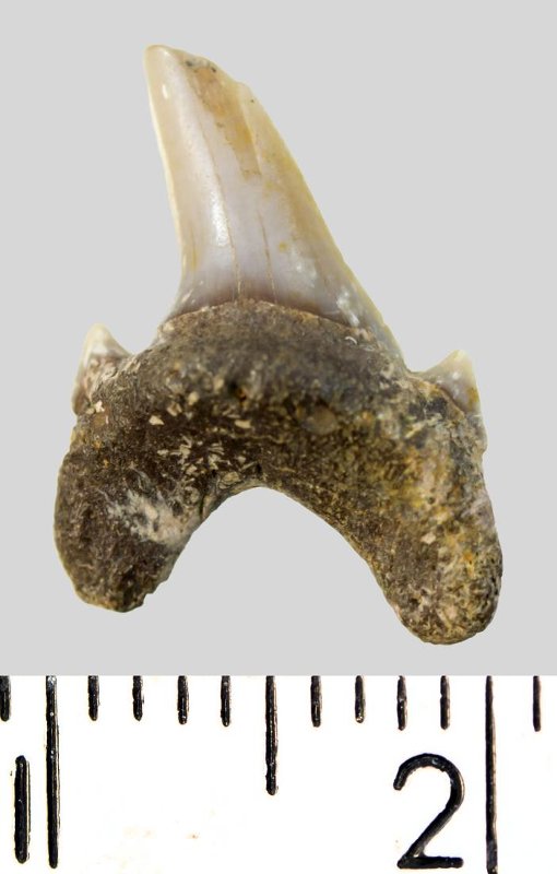 Зуб. Акула. Archaeolamna cf. kopingensis (Davis, 1890). Классификация: Хордовые Chordata, Позвоночные Vertebrata, Хрящевые рыбы Chondrichthyes, Пластиножаберные Elasmobranchii, Акулы Selachii, Ламнообразные Lamniformes