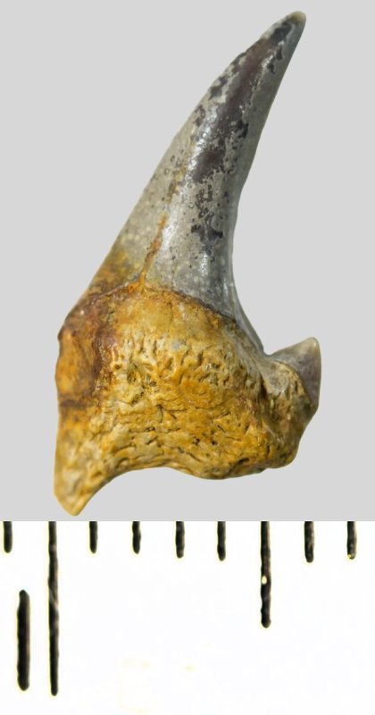 Зуб (фрагмент). Акула. Archaeolamna cf. kopingensis (Davis, 1890). Классификация: Хордовые Chordata, Позвоночные Vertebrata, Хрящевые рыбы Chondrichthyes, Пластиножаберные Elasmobranchii, Акулы Selachii, Ламнообразные Lamniformes