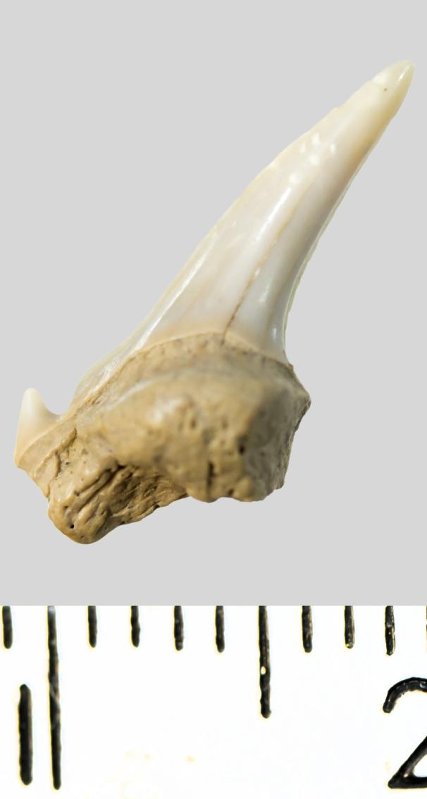 Зуб (фрагмент). Акула. Archaeolamna cf. kopingensis (Davis, 1890). Классификация: Хордовые Chordata, Позвоночные Vertebrata, Хрящевые рыбы Chondrichthyes, Пластиножаберные Elasmobranchii, Акулы Selachii, Ламнообразные Lamniformes