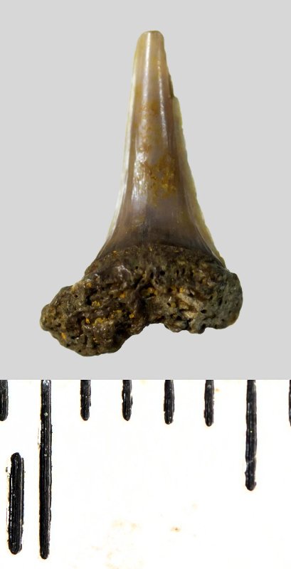 Зуб (фрагмент). Акула. Eostriatolamia subulata (Agassiz, 1843). Классификация: Хордовые Chordata, Позвоночные Vertebrata, Хрящевые рыбы Chondrichthyes, Пластиножаберные Elasmobranchii, Акулы Selachii, Ламнообразные Lamniformes