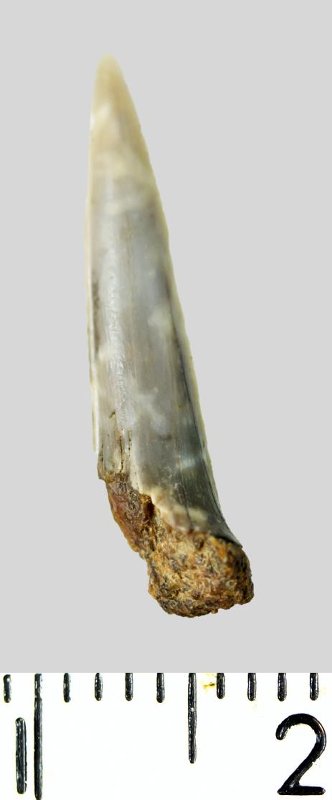 Зуб (фрагмент). Акула. Striatolamia macrota (Agassiz, 1843). Классификация: Хордовые Chordata, Позвоночные Vertebrata, Хрящевые рыбы Chondrichthyes, Пластиножаберные Elasmobranchii