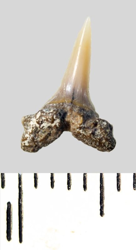 Зуб. Акула. Eostriatolamia subulata (Agassiz, 1843). Классификация: Хордовые Chordata, Позвоночные Vertebrata, Хрящевые рыбы Chondrichthyes, Пластиножаберные Elasmobranchii, Акулы Selachii, Ламнообразные Lamniformes