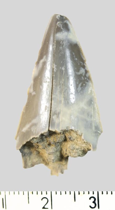 Зуб (фрагмент). Акула. Otodus obliquus Agassiz, 1843. Классификация: Хордовые Chordata, Позвоночные Vertebrata, Хрящевые рыбы Chondrichthyes, Пластиножаберные Elasmobranchii
