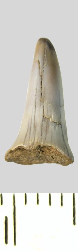 Зуб (фрагмент). Акула. Palaeohypotodus lerichei Glueckman, 1964. Классификация: Хордовые Chordata, Позвоночные Vertebrata, Хрящевые рыбы Chondrichthyes, Пластиножаберные Elasmobranchii