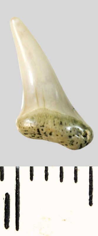 Зуб. Акула. Striatolamia sp. Классификация: Хордовые Chordata, Позвоночные Vertebrata, Хрящевые рыбы Chondrichthyes, Пластиножаберные Elasmobranchii