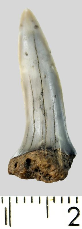Зуб (фрагмент). Акула. Striatolamia macrota (Agassiz, 1843). Классификация: Хордовые Chordata, Позвоночные Vertebrata, Хрящевые рыбы Chondrichthyes, Пластиножаберные Elasmobranchii