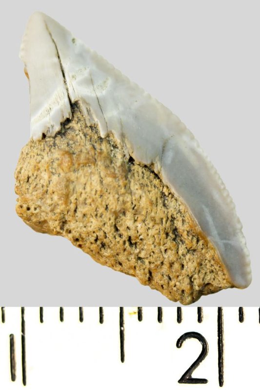 Зуб (фрагмент). Акула. Anacorax kaupi (Agassiz, 1843). Классификация: Хордовые Chordata, Позвоночные Vertebrata, Хрящевые рыбы Chondrichthyes, Пластиножаберные Elasmobranchii