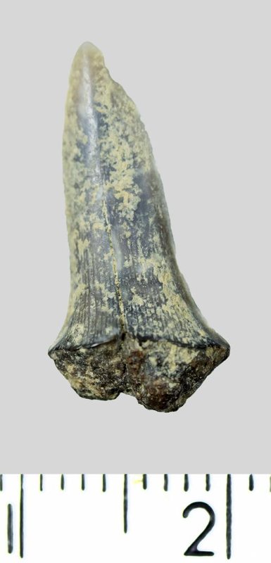 Зуб (фрагмент). Акула. Striatolamia teretidens (White, 1931). Классификация: Хордовые Chordata, Позвоночные Vertebrata, Хрящевые рыбы Chondrichthyes, Пластиножаберные Elasmobranchii