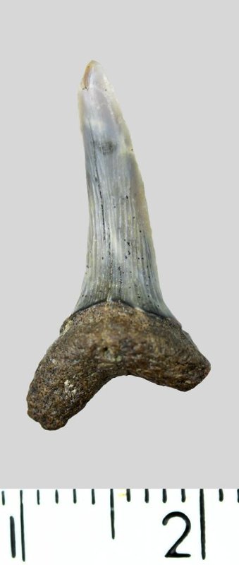 Зуб. Акула. Striatolamia teretidens (White, 1931). Классификация: Хордовые Chordata, Позвоночные Vertebrata, Хрящевые рыбы Chondrichthyes, Пластиножаберные Elasmobranchii
