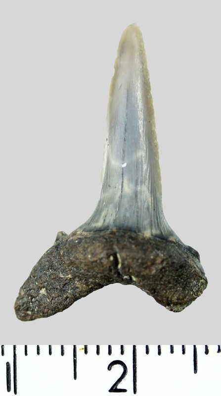 Зуб. Акула. Striatolamia teretidens (White, 1931). Классификация: Хордовые Chordata, Позвоночные Vertebrata, Хрящевые рыбы Chondrichthyes, Пластиножаберные Elasmobranchii