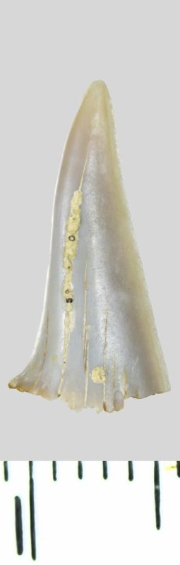 Зуб (фрагмент). Акула. Xyphodolamia sp. Классификация: Хордовые Chordata, Позвоночные Vertebrata, Хрящевые рыбы Chondrichthyes, Пластиножаберные Elasmobranchii
