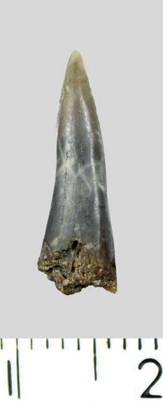 Зуб (фрагмент). Акула. Striatolamia ex. gr. teretidens (White, 1931). Классификация: Хордовые Chordata, Позвоночные Vertebrata, Хрящевые рыбы Chondrichthyes, Пластиножаберные Elasmobranchii